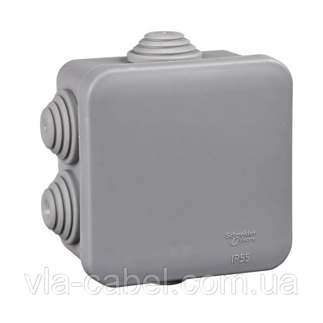 Квадратна розподільна коробка відкритої установки, з кришкою, що замикається. З шістьма великими східцями для введення кабелів і гофротруб.